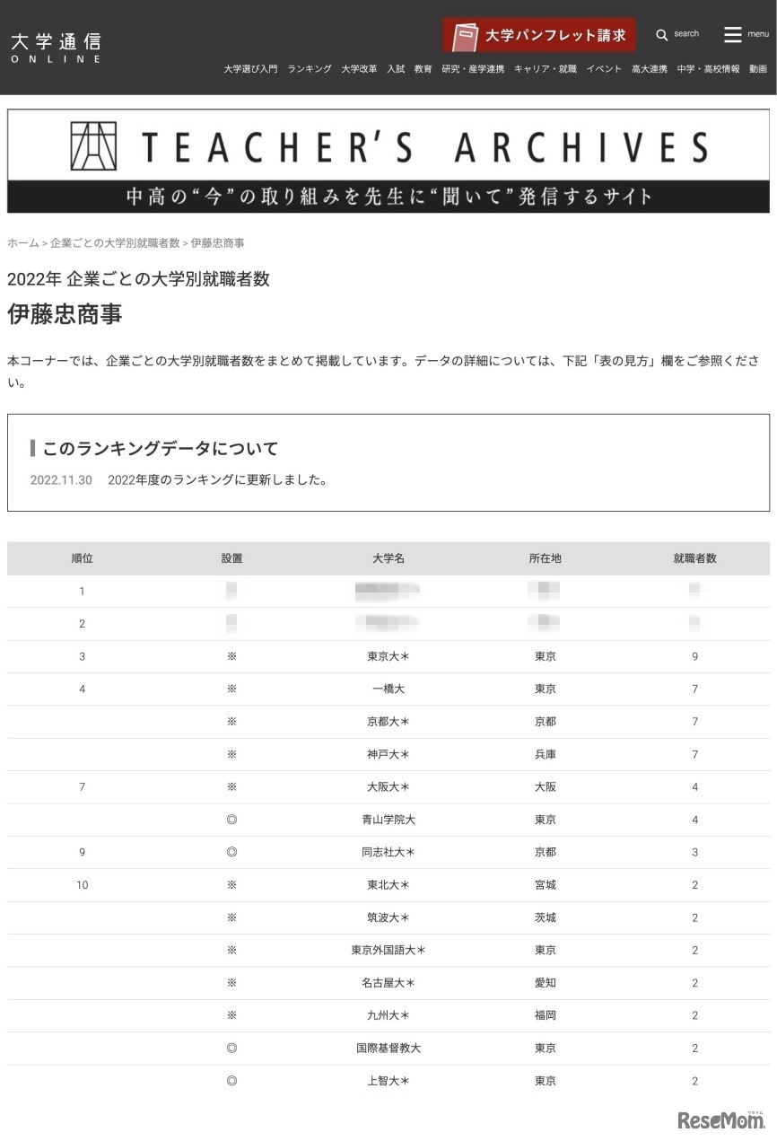 画像出典:大学通信ONLINE 2022年 企業ごとの大学別就職者数ランキング「伊藤忠商事」1位~10位
