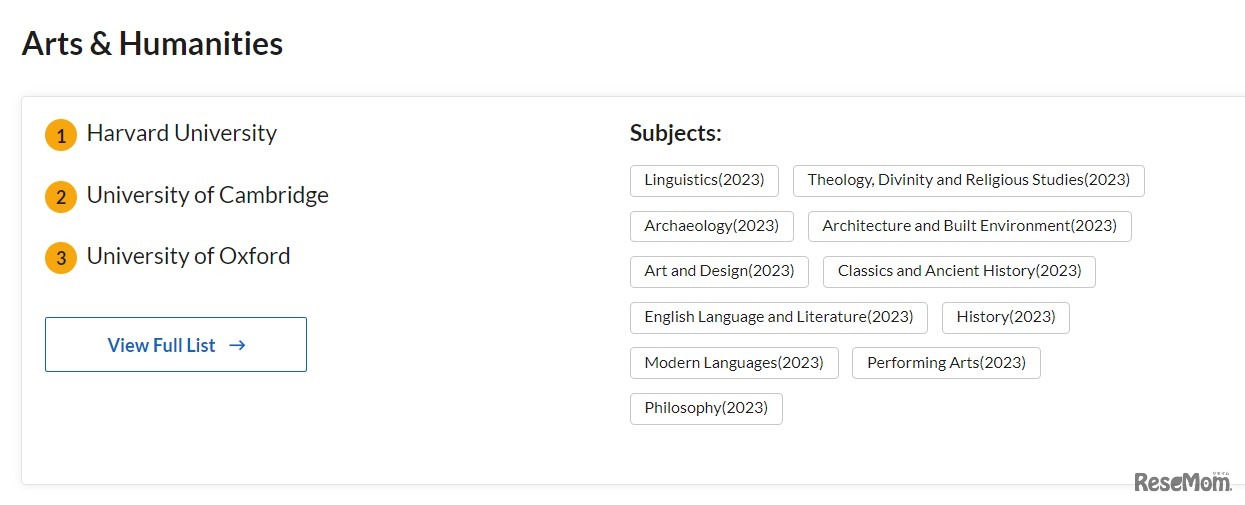画像出典:Quacquarelli Symonds(QS World University Rankings by Subject2023) Arts & Humanities