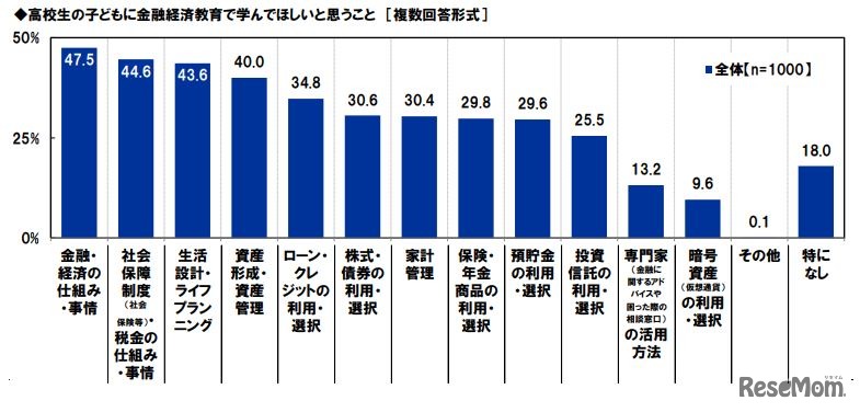 画像出典:アクサ生命保険 高校生の子供に金融経済教育で学んでほしいと思うこと