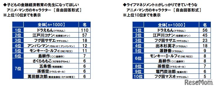 子供の金融経済教育の先生になってほしいアニメ・マンガのキャラクター、ライフマネジメントがしっかりできていそうなアニメ・マンガのキャラクター