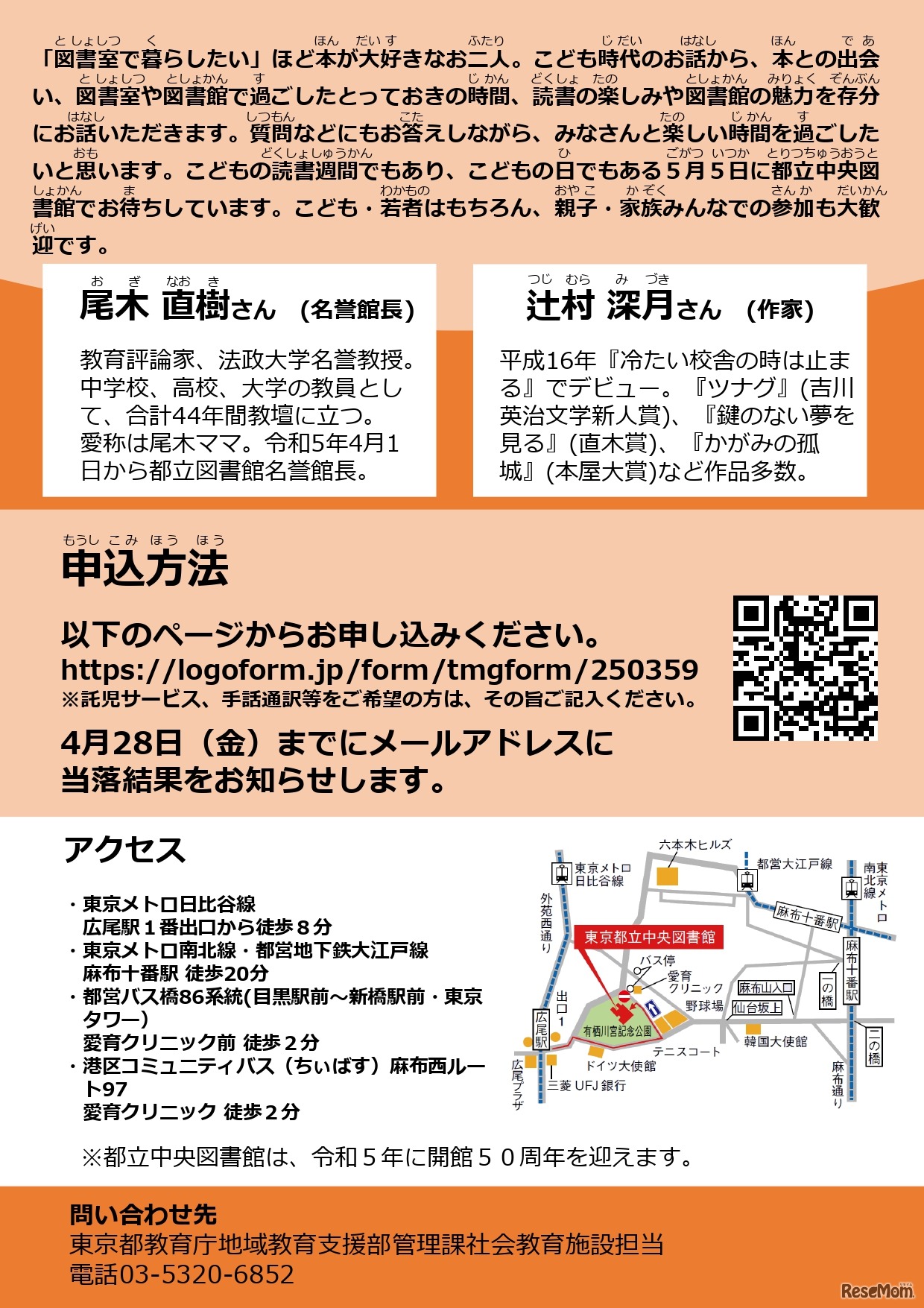 東京都教育委員会は2023年5月5日、4月1日から都立図書館名誉館長に就任した尾木直樹氏と作家の辻村深月氏を招き、トークイベントを開催する。会場は東京都立中央図書館。定員80名で応募多数の場合は抽選。参加費無料。申込締切4月25日。