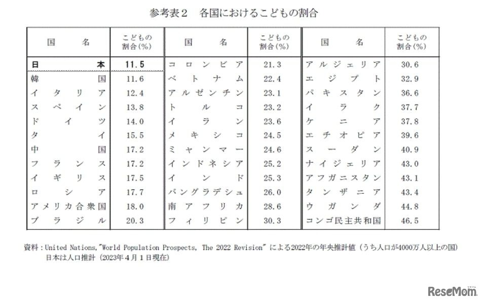 総務省は5月5日の「こどもの日」にちなみ、2023年4月1日現在の子供の数(15歳未満人口)の推計を発表した。子供の数は、過去最少の1,435万人で42年連続の減少となった。総人口に占める子供の割合は11.5%で、49年連続で低下した。
