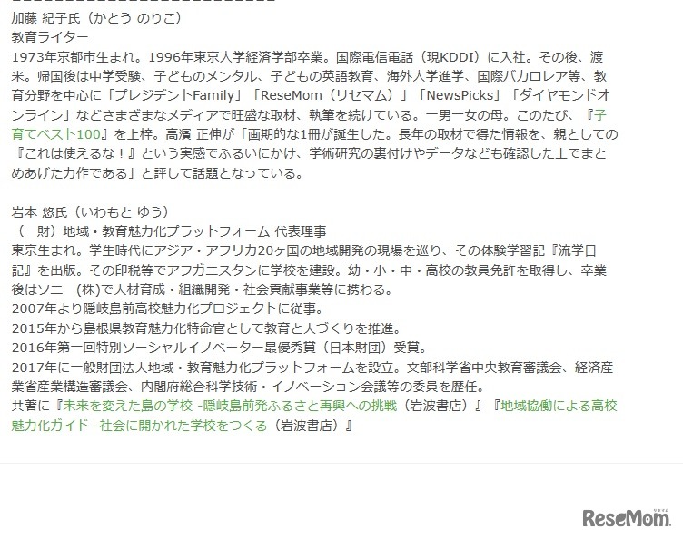花まる子育てカレッジは2023年6月16日、「子育てベスト100」の著者、加藤紀子氏による対談シリーズ「意志ある若者を育てる『地域みらい留学』ってなんだ?」をオンライン開催する。参加費1,000円(税込)。