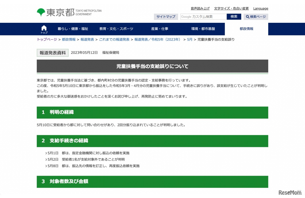 東京都は2023年5月12日、5月10日に東京都から振込をした3月・4月分の児童扶養手当について、誤支給が生じていたと発表した。598名に二重支給した他、支給対象外の1名に誤支給。総額は5,132万円にのぼり、都は事情の説明と謝罪を行っているという。