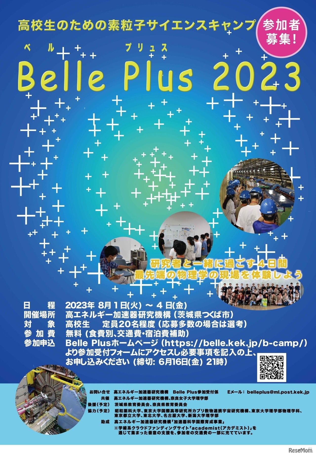 素粒子原子核研究所は2023年8月1日~4日の3泊4日、高校生対象に、素粒子サイエンスキャンプ「Belle Plus2023」を開催する。高エネルギー加速器研究機構(以下KEK)つくばキャンパスにて。参加費無料(食費別、交通費・宿泊費補助)。申込みは6月16日まで。