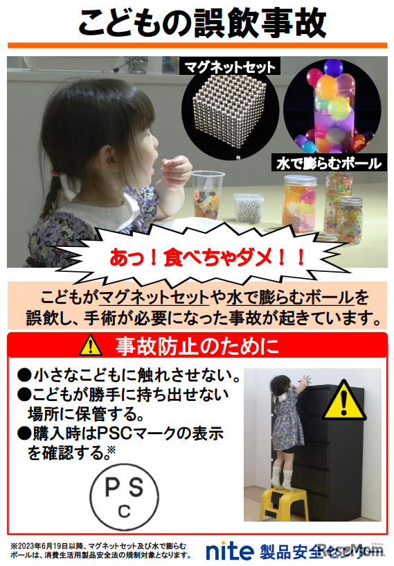 経済産業省は2023年5月16日、消費生活用製品安全法施行令の一部を改正する政令が閣議決定されたことを公表した。これにより、子供の安全のため玩具への新たな規制が導入され、強力な磁力を有する複数個の磁石を組み合わせた「マグネットセット」等の販売ができなくなる。