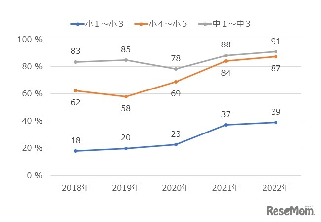 パソコンでキーボード入力ができる子供が増え、小学校高学年および中学生で約9割となったことが、NTTドコモ モバイル社会研究所が行った調査から明らかになった。2018年の調査開始以来初めて、携帯電話の文字入力と並ぶ割合まで到達した。