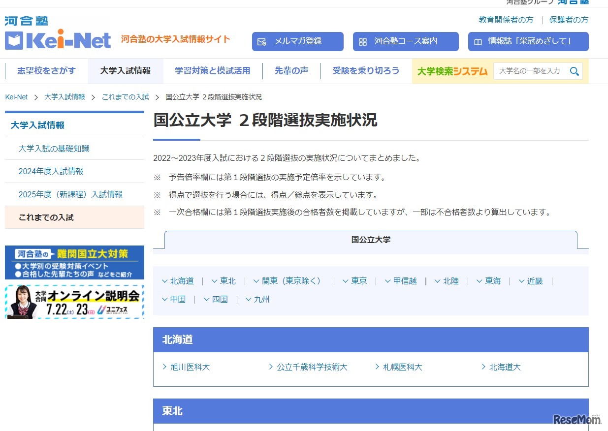河合塾の大学入試情報サイト「Kei-Net」は2023年5月25日、国立大学の2段階選抜実施状況について、2022年度と2023年度の2年分を大学別にまとめて掲載した。