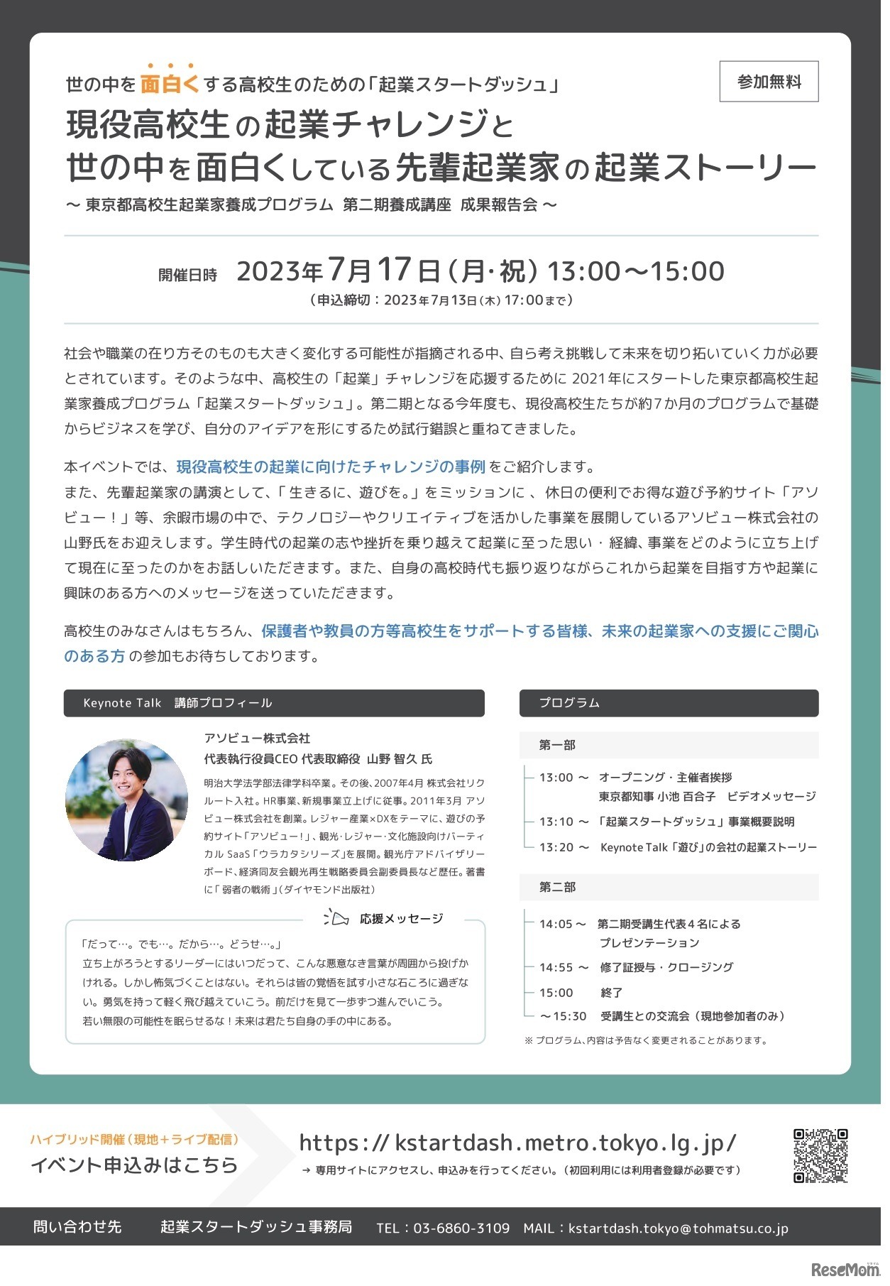 東京都は2023年7月17日、高校生等を対象に「東京都高校生起業家養成プログラム 第二期養成講座 成果報告会」をハイブリット開催する。参加無料、来場定員100名。
