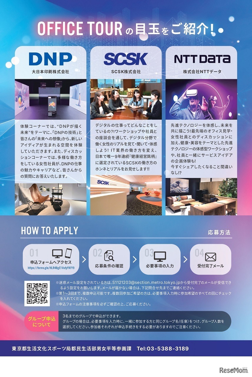 東京都は、デジタル分野での女性活躍を推進するため、女子中高生向けのオフィスツアーを実施する。実施時期は2023年7月・8月の夏休み期間。訪問先は、大日本印刷(DNP)、SCSK、NTTデータの3社。