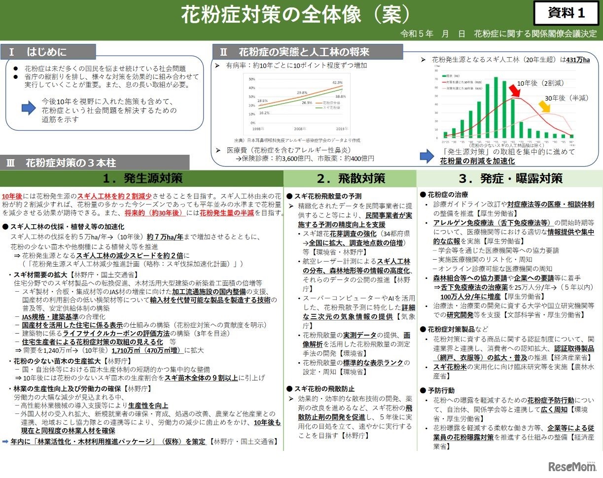 政府の「花粉症に関する関係閣僚会議」は2023年5月30日、30年後に花粉発生量の半減を目指す「花粉症対策の全体像」を取りまとめた。花粉発生源となるスギ人工林を10年後には約2割削減し、花粉量の削減を加速化するとしている。