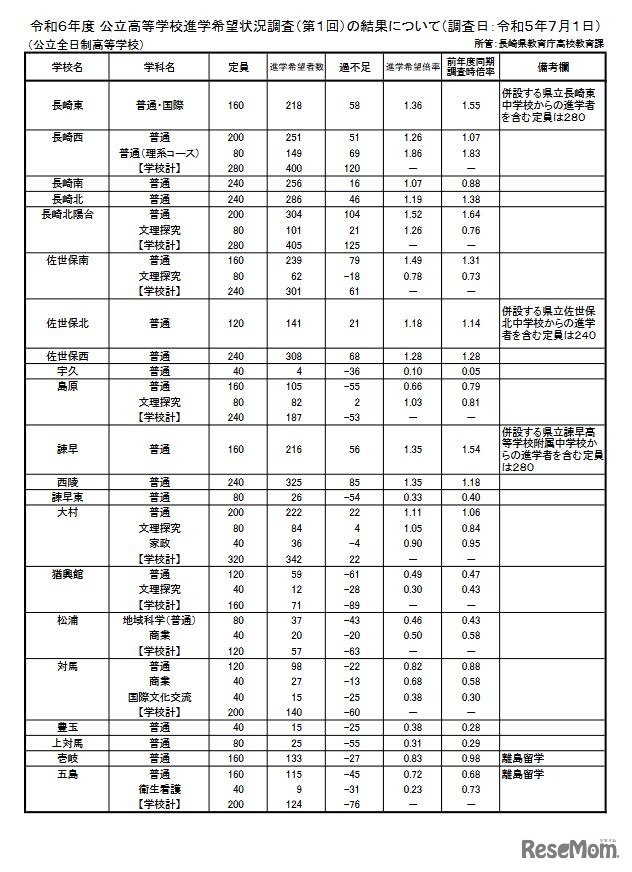 長崎県教育委員会は2023年7月18日、2024年度(令和6年度)長崎県公立高等学校進学希望状況調査(第1回)の結果を公表した。進学希望倍率は、長崎工業(機械)2.33倍、長崎工業(建築)1.93倍、長崎西(普通・理系コース)1.86倍などが高かった。