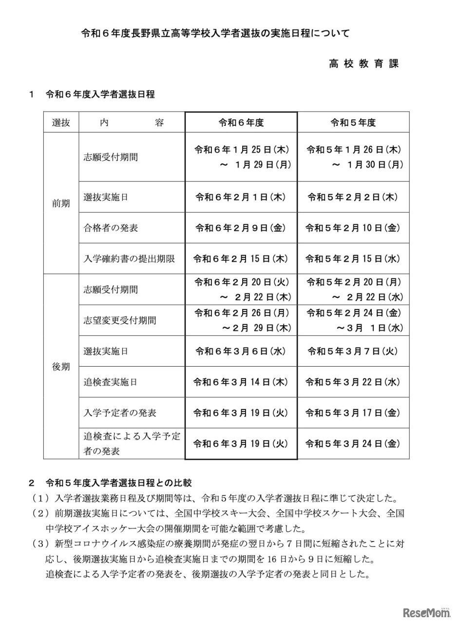 令和6年度長野県立高等学校入学者選抜の実施日程について