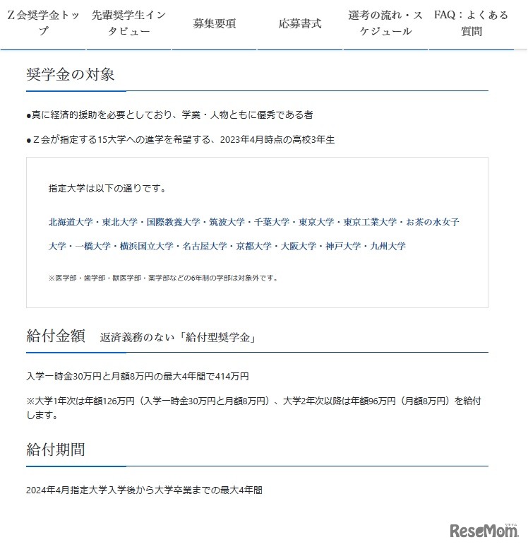 Z会は2023年8月25日より、2024年4月に大学へ進学の高3生を対象とした「Z会奨学生」の第2クールの募集を開始した。入学一時金30万円と月額8万円、大学卒業までの最大4年間給付。応募締切は、10月10日必着。