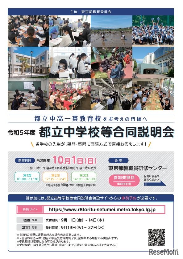 東京都教育委員会は2023年10月29日、11月5日、12日、都立高校などによる相談会「都立高等学校等合同説明会」を会場とオンラインで開催する。10月1日には、都立中高一貫教育校などが参加する会場型個別相談会「都立中学校等合同説明会」を開く。参加無料。事前申込制。