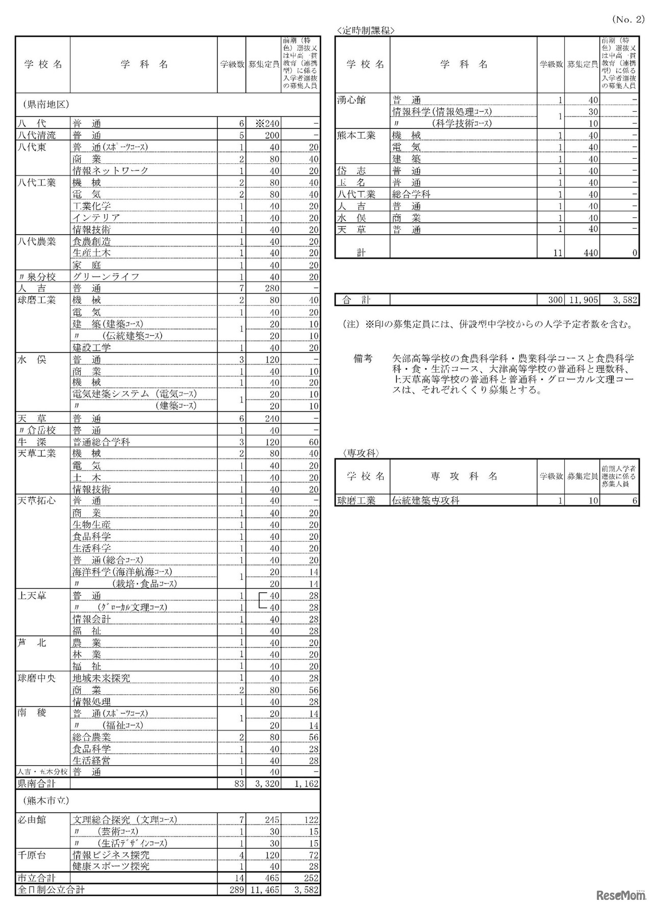 熊本県教育委員会は2023年9月5日、2024年度(令和6年度)熊本県立高校入試について学校別の生徒募集定員を発表した。全日制合計では、前年度(2022年度)と同数の1万1,000人を募集。各学校の募集定員は、熊本(普通)400人、済々黌(普通)400人など。