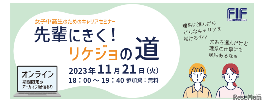 フューチャー イノベーション フォーラム(FIF)は2023年11月21日、女子中高生を対象としたキャリア教育イベント「先輩にきく!リケジョの道」をオンラインにて開催する。参加は無料、申込みは11月17日まで。