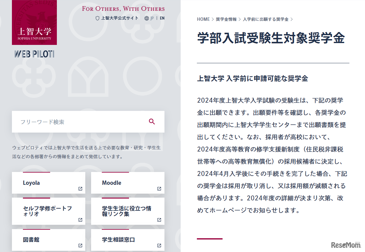 画像出典:上智大学 上智大学「学部入試受験生対象奨学金」