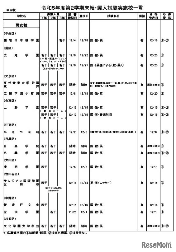 東京都生活文化スポーツ局私学部は2023年11月9日、2023年度(令和5年度)第2学期末に実施する都内私立中学校・高等学校の転・編入試験について発表した。都内の中学校74校、高校92校(全日制83校、定時制1校、通信制8校)が転・編入試験を実施する。
