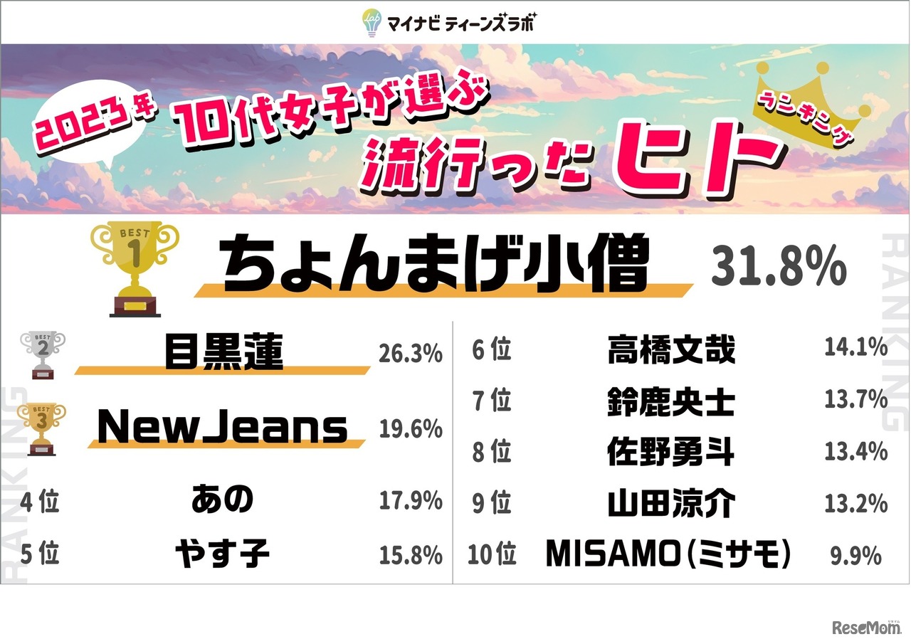 マイナビが運営するティーンのマーケティングやリサーチを行う「マイナビティーンズラボ」は2023年11月15日、「2023年10代女子が選ぶトレンドランキング」を発表した。ヒト部門の1位は「ちょんまげ小僧」、コトバ部門の1位は「なぁぜなぁぜ」がランクインした。