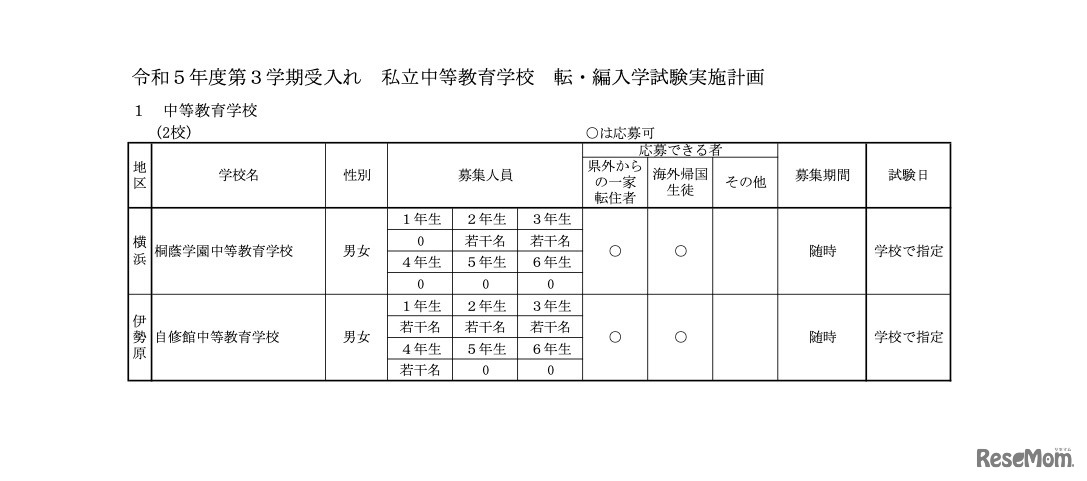 画像出典:神奈川県福祉子どもみらい局子どもみらい部私学振興課 令和5年度第3学期受入れ 私立中等教育学校 転・編入学試験実施計画<全日制>