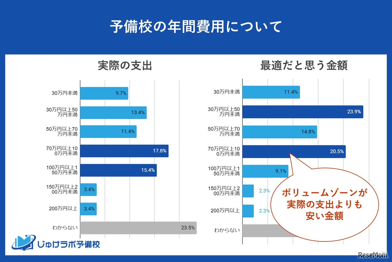 じゅけラボ予備校は2023年11月24日、大学受験の予備校や塾の費用に関する実態調査の結果を公表した。実際にかかっている月額授業料は「3万円以上5万円未満」が最多で、浪人生・浪人経験者が考える適正価格と同じであることがわかった。