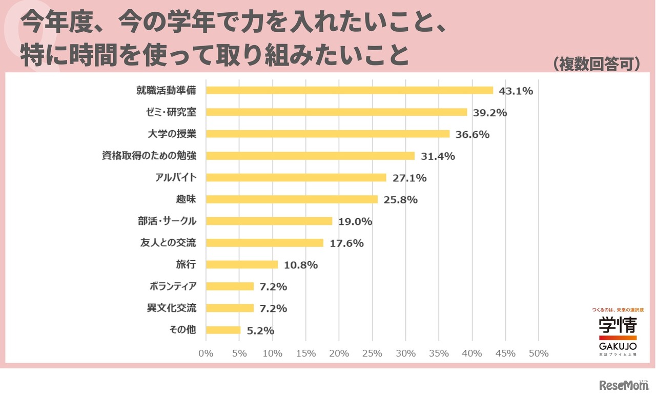 学情は2023年11月29日、「学生生活の満足度」の調査結果を公表した。約8割の学生が「大学生活に満足している」と回答した。大学生活で力を入れていることは、「大学の授業」「アルバイト」、今年度取り組みたいことは「就職活動準備」「ゼミ・研究室」となった。