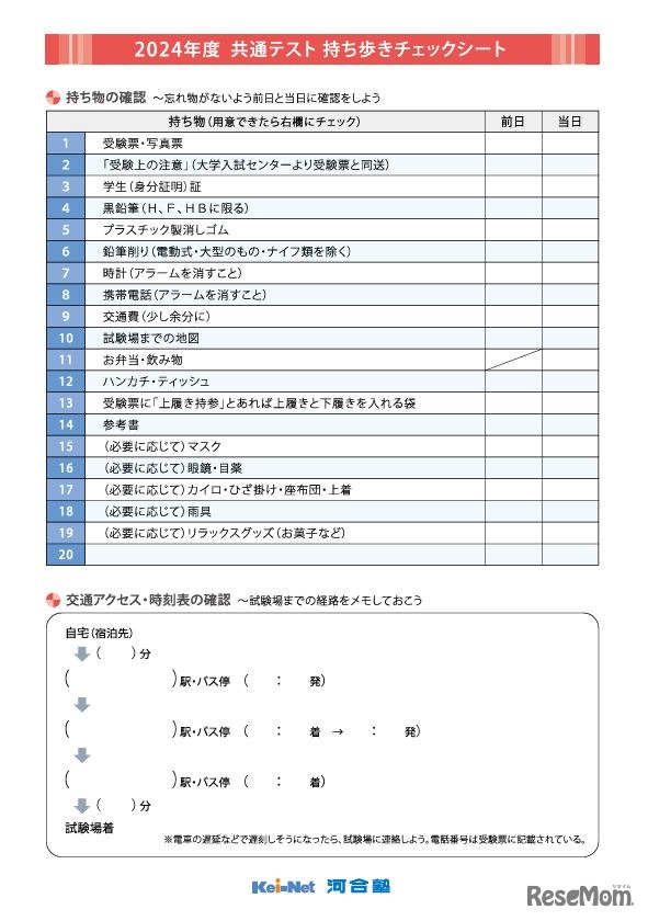河合塾の大学入試情報サイト「Kei-Net」は2023年12月6日、2024年度入試情報に「2024年度共通テスト受験ガイド」を掲載した。約1か月後に迫った試験本番に向け、万全の態勢で臨むための準備や注意点など、事前に確認しておくべき内容をまとめている。