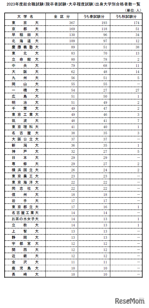 2023年度総合職試験(院卒者試験・大卒程度試験)出身大学別合格者数一覧