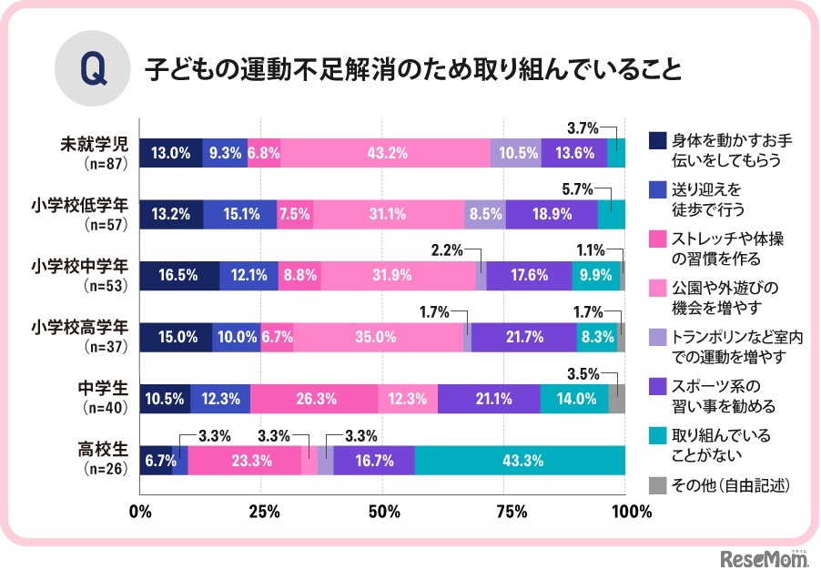 「ママソレ」を運営するKG情報は2023年12月14日、「子どもの週の運動時間」についてのアンケート調査の結果を公開した。ほとんどの保護者が「運動習慣をつけることは大切」と考えているが、約半数が運動不足と感じており、運動不足解消のための取組みを行っていることが明らかになった。