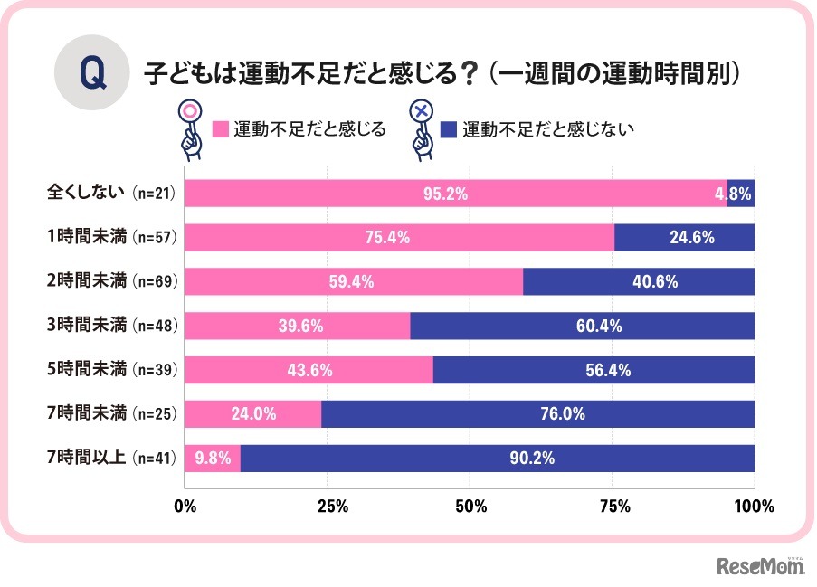 画像出典:ママソレ「子どもの運動習慣についてのアンケート」 子供は運動不足と感じる?(1週間の運動時間別)
