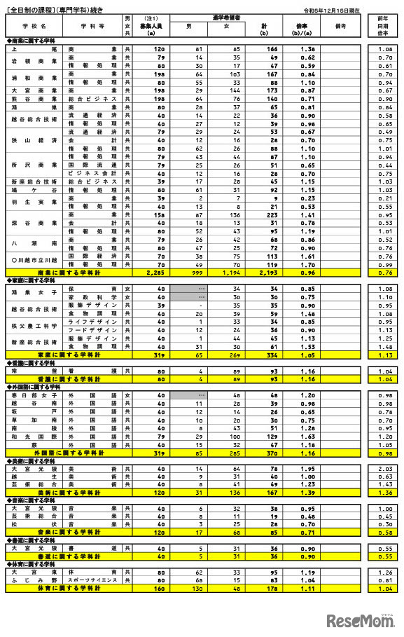 埼玉県教育委員会は2024年1月11日、2024年3月中学校等卒業予定者の進路希望状況調査(2023年12月15日現在)の結果を公表した。高等学校等進学希望数の割合は98.3%。学校別の倍率は市立川越(普通)2.64倍、市立浦和(普通)2.34倍などが高くなっている。