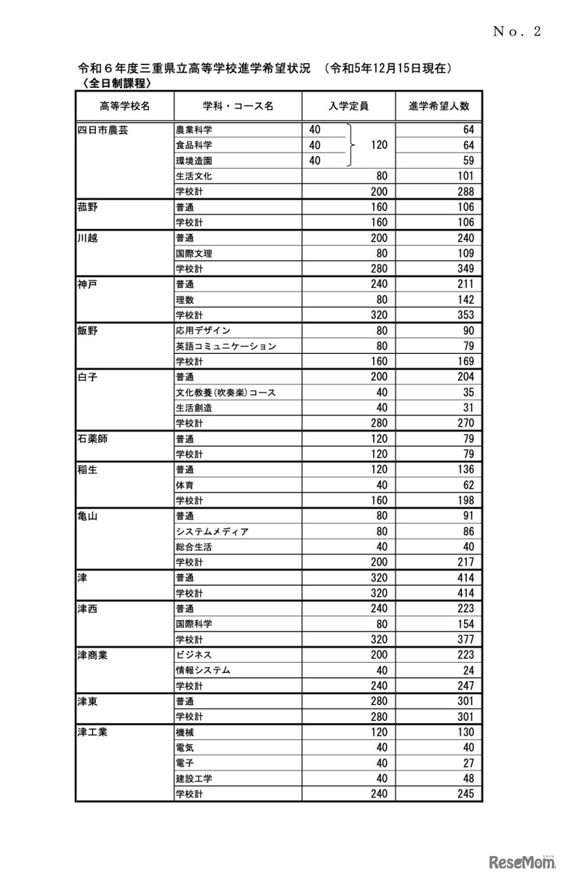 三重県教育委員会は2024年1月13日、2024年度(令和6年度)三重県立高等学校進学希望状況(2023年12月15日現在)を公表した。県内中学校等卒業予定者のうち、全日制課程進学希望者は1万1,002人。学校別の希望倍率は、松阪(理数)2.4倍、津西(国際科学)1.93倍など。