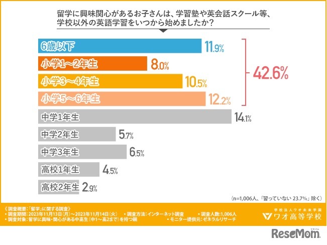 ワオ高等学校は2024年1月16日、「高校留学」に関する調査結果を公表した。留学に興味・関心がある中高生のうち約4割が中学校入学前に英語を学び始めており、半年以上の高校留学させたいと考える保護者が5割超となることがわかった。