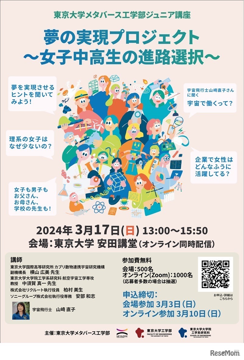 東京大学メタバース工学部は、ジュニア講座「夢の実現プロジェクト~女子中高生の進路選択~」をハイブリッド開講する。おもに中高生(男子学生も可)と保護者、教員が対象だが、誰でも参加できる。定員は、会場500名(抽選)、オンライン1,000名。申込期限は、会場が3月3日、オンラインが3月10日。