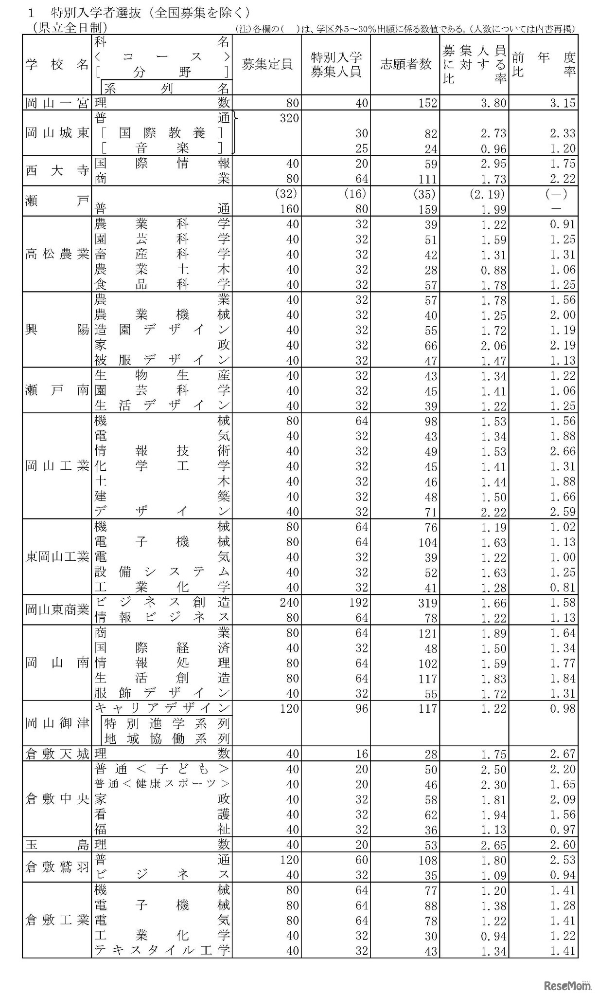 岡山県教育委員会は2024年1月29日、2024年度(令和6年度)岡山県公立高等学校特別入学者選抜等の確定志願者数を公表した。全日制全体の特別入学者選抜の志願倍率は1.52倍。最高倍率は岡山一宮(理数)3.80倍となった。