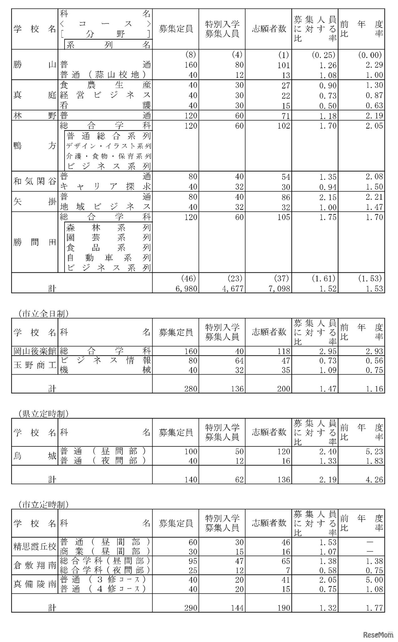 画像出典:岡山県教育委員会 令和6年度岡山県公立高等学校特別入学者選抜等志願者数(県立全日制、ほか)