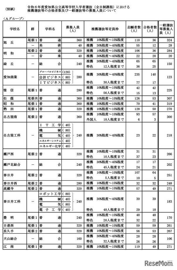 画像出典:愛知県教育員会 令和6年度愛知県公立高等学校入学者選抜(全日制課程)における推薦選抜等の合格者数・一般選抜等の募集人員について