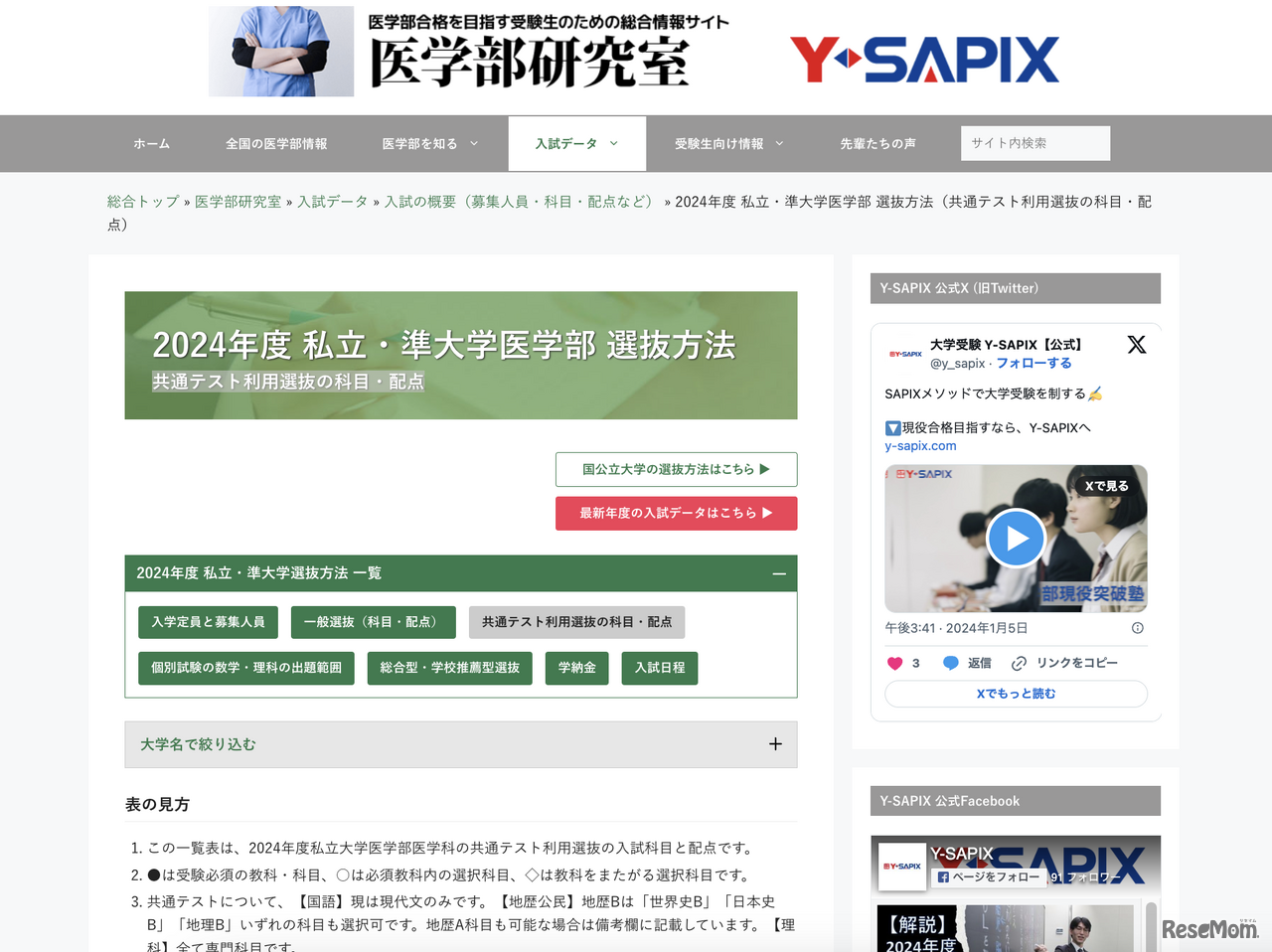 Y-SAPIXの情報サイト「医学部研究室」は2024年2月9日、「2024年度私立・準大学医学部 選抜方法」の32校の一般選抜(科目・配点)と、17校の共通テスト利用選抜の科目・配点を掲載した。慶大、東京慈恵医大、順天堂大などの選抜方法について確認できる。