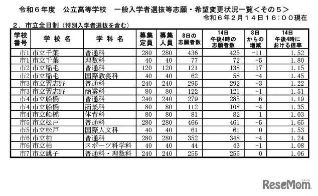 令和6年度千葉県公立高等学校 一般入学者選抜等志願・希望変更状況一覧(2024年2月14日午後4時現在)