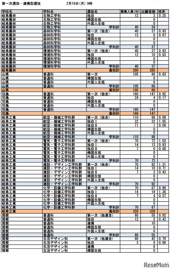 画像出典:岐阜県教育委員会 令和6年度入学者選抜 第一次選抜・連携型選抜(2024年2月19日午前9時時点)出願状況