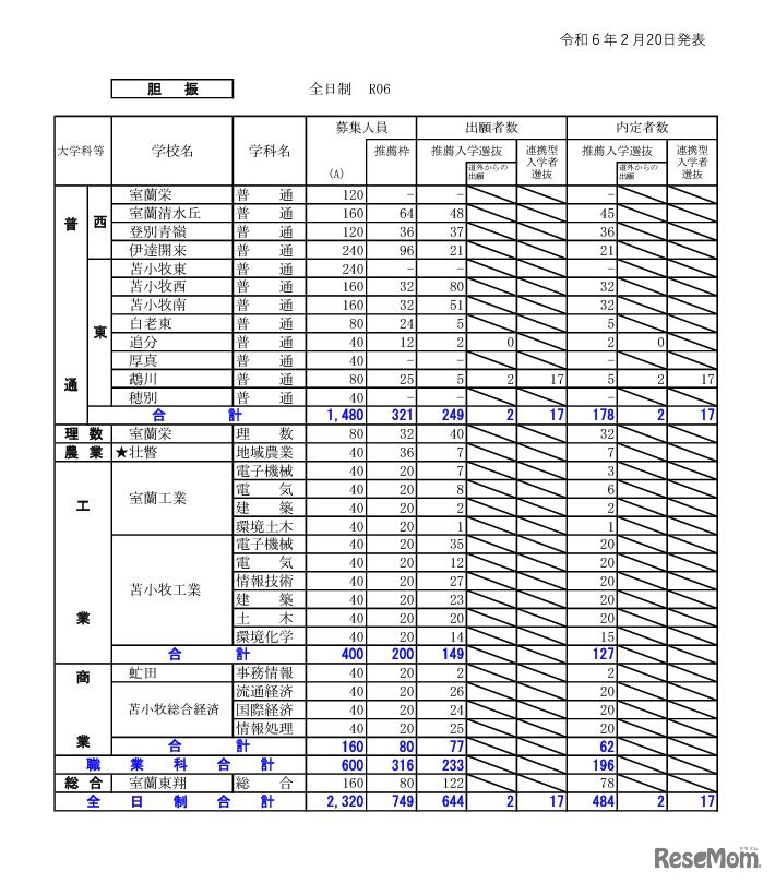 画像出典:北海道教育委員会「令和6年度公立高等学校入学者選抜(推薦・連携型合格内定者数等)」 胆振学区