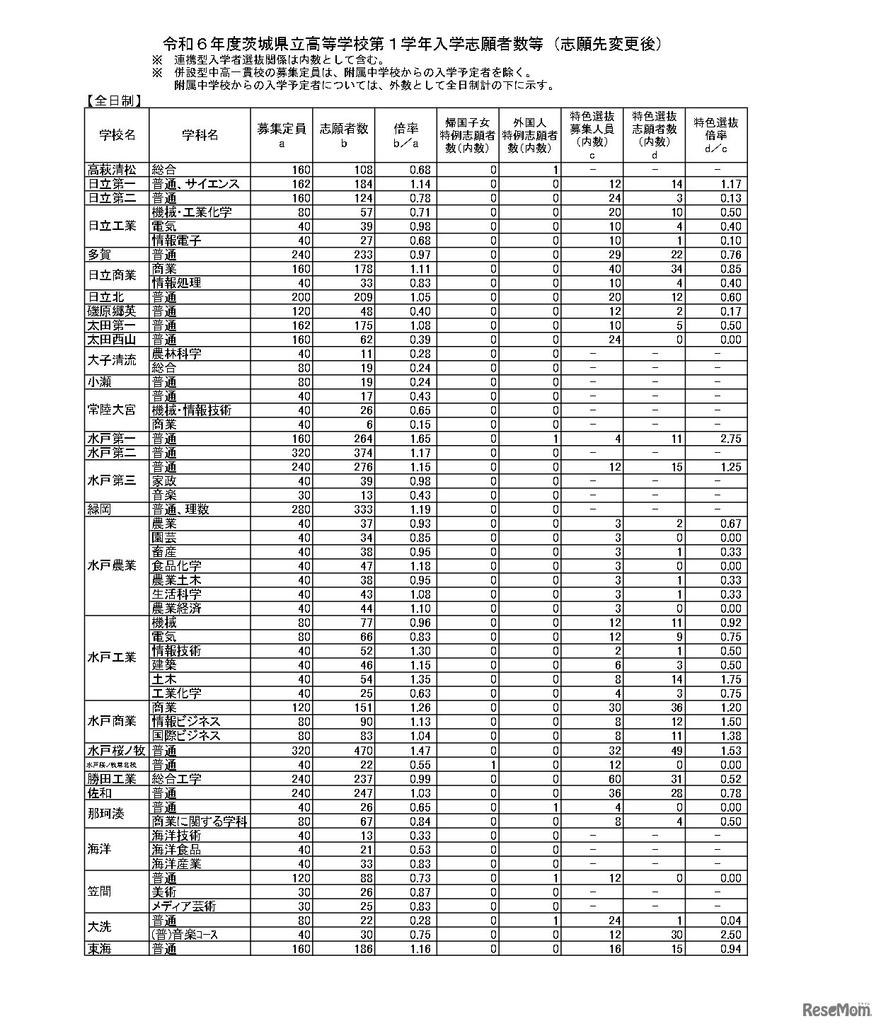 令和6年度茨城県立高等学校第1学年入学志願者数等(志願先変更後)
