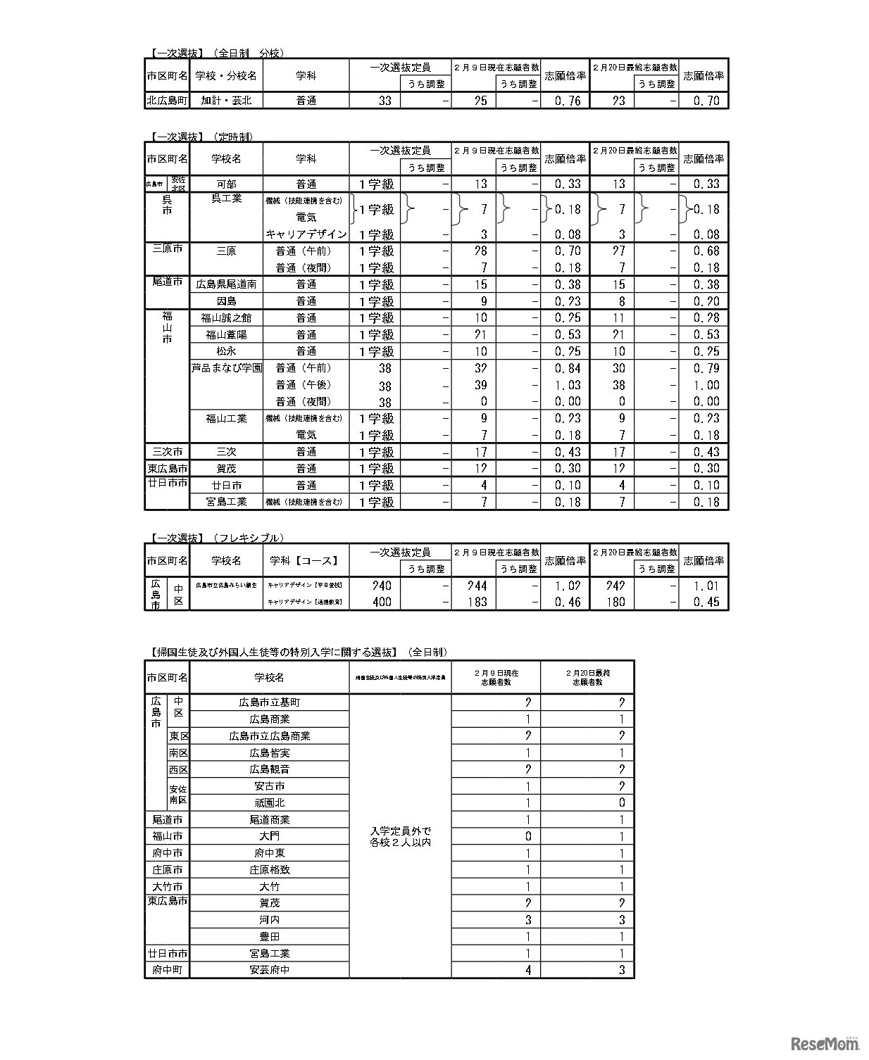 令和6年度 広島県公立高等学校入学者選抜一次選抜、帰国生徒及び外国人生徒等の特別入学に関する選抜の志願状況