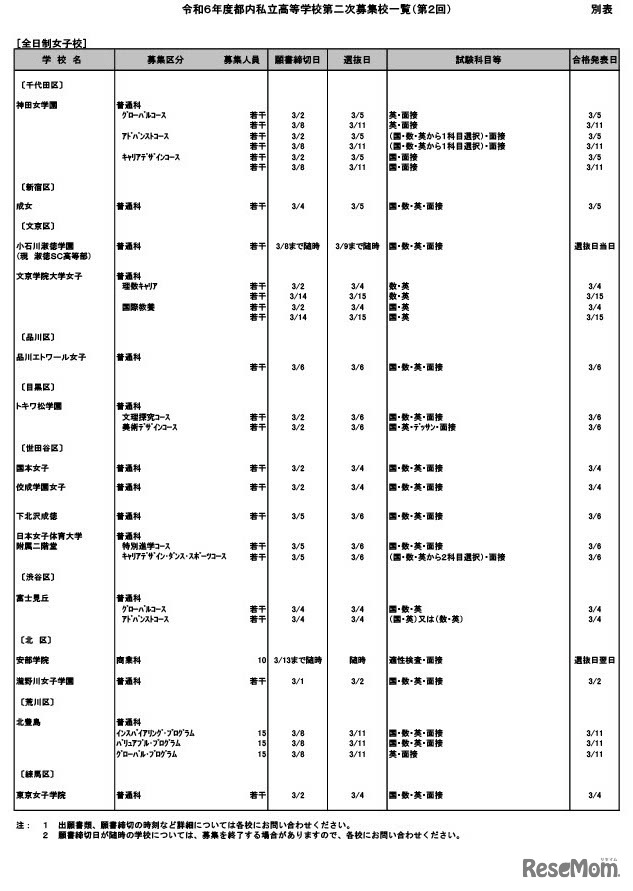 画像出典:東京都生活文化スポーツ局 令和6年度都内私立高等学校第二次募集校一覧(第2回)全日制女子校