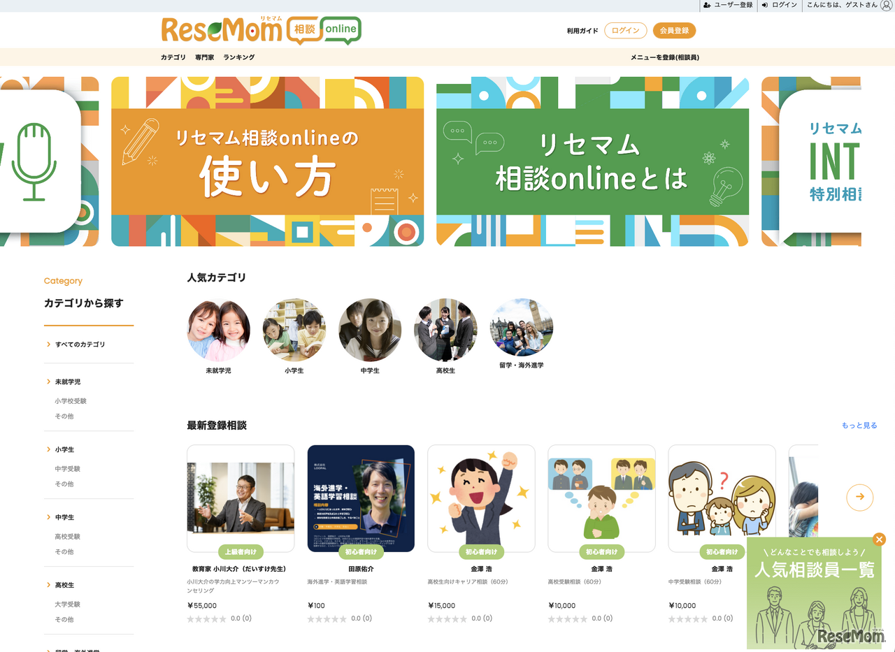 お子さまの進路や学びについてオンラインで相談できる「リセマム相談online」。サービス開始を記念して、人気の専門家5名の先生方ー小川大介氏、金澤浩氏、後藤和浩氏、田原佑介氏、村田学氏ーを特別相談員として迎え2024年2月27日開設。