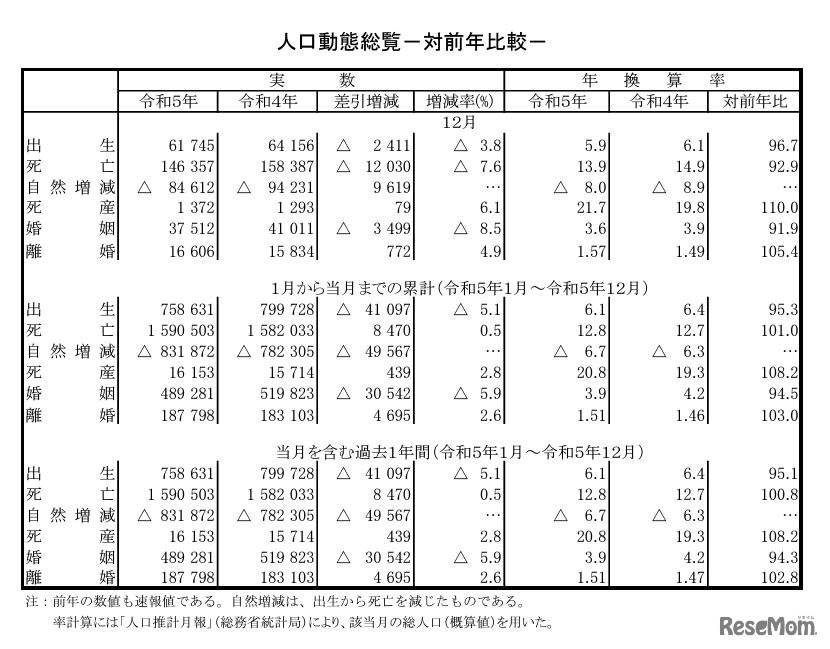 画像出典:厚生労働省「人口動態統計速報(令和5年12月分)」 人口動態総覧(対前年比較)
