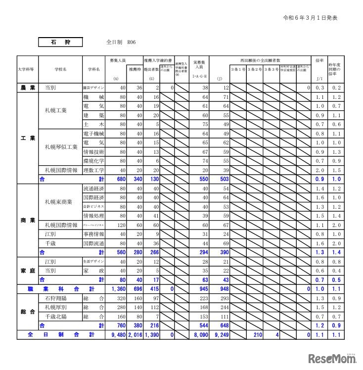 画像出典:北海道教育委員会「令和6年度公立高等学校入学者選抜 再出願後の出願状況」 石狩学区