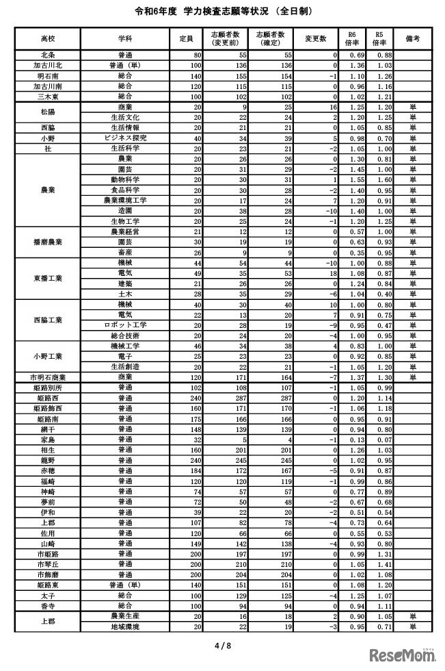 兵庫県教育委員会は2024年3月4日、2024年度(令和6年度)兵庫県公立高等学校入学者選抜の確定出願状況を公表した。全日制の志願者は2万2,677人で、志願倍率は1.04倍。学校・学科別は、神戸(普通)1.17倍、長田(普通)1.09倍、姫路西(普通)1.20倍など。