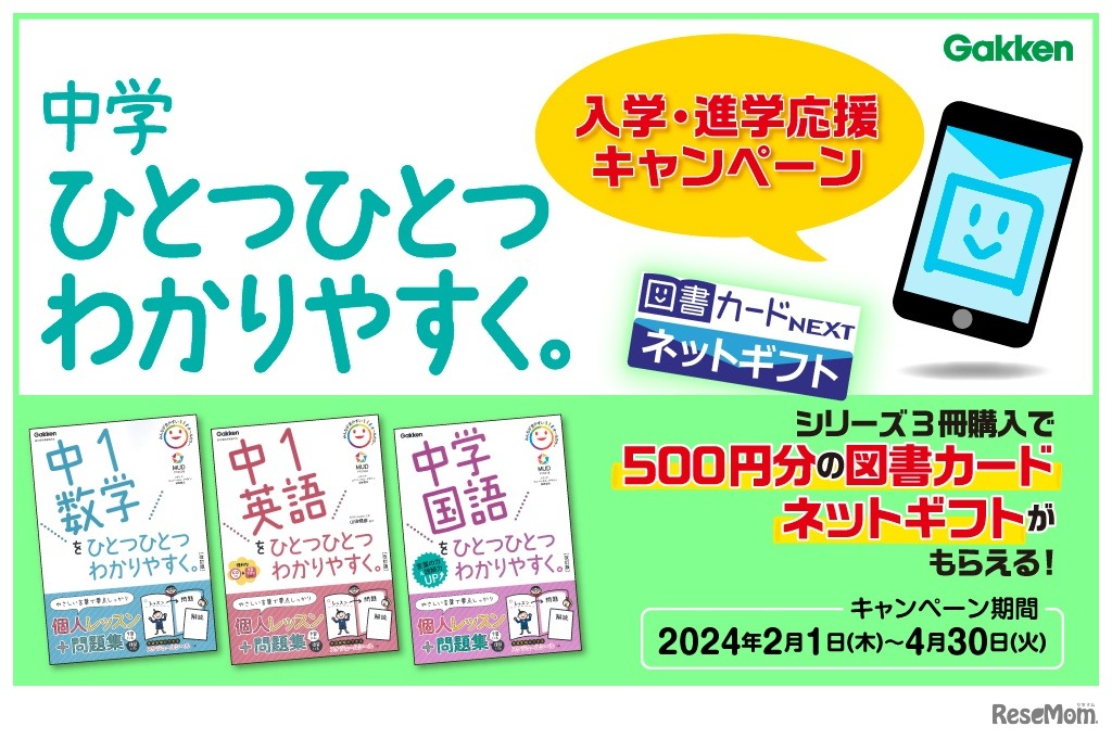画像出典:学研ホールディングス 「中学ひとつひとつわかりやすく。」シリーズ3冊購入で図書カードネットギフト500円分全員プレゼントキャンペーン